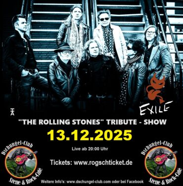 “EXILE“ – A Tribute to “THE ROLLING STONES“ Live am 13.12.2025 ab 20:00 Uhr im Dschungel-Club Moers VVK Beginn: 23.06.2025 Moers-Scherpenberg: Am Samstag, den 13. Dezember kommt mit der aus Rotterdam stammenden Band “EXILE“ ab 20:00 Uhr einer der besten Tribute Act’s in Europa mit den besten Songs von “THE ROLLING STONES“ zum zweiten Mal in den Moerser Dschungel-Club. Ein hochprofessionelles, echtes Highlight kommt nach Moers – Rolling Stones Fans werden absolut begeistert sein!!! Überzeuge Dich selber: Ende 1960er Jahre tauchte der Begriff „Supergruppe“ auf. Und genau das, ist was „Exile- Rolling Stones“ am besten beschreibt: eine Fusion von Sieben Top Musikern, die bereits in eherne Rolling Stones Tribute Bands Activ waren und auch mit Herman Brood, Gruppo Sportivo u.a. gespielt haben. Es müssen keine Zutaten hinzugefügt werden: Goats Heads Soup, servierfertig! Exile verdankt seinen Namen dem absoluten Meisterwerk von The Rolling Stones, „Exile on Main Street“ aus dem Jahr 1972. Natürlich greift „Exile“ nicht nur auf die Klassiker dieses genialen Albums zurück. Erwartet den Besucher eine echte, energiegeladene Rolling Stones Tribute Show voller Hits und Album Tracks, aber mit der gleichen Dynamik und Intensität, die The Stones in den 70er Jahren gebracht hat ohne eine Nachahmung zu sein. “EXILE“: Pat de Wolf- Trommeln, Schlagzeug Brian Kruit – Bass, Gesang Mike Vos – Gesang, Akustikgitarre, Mundharmonika, Schlagzeug Stephan Bijl – Gitarre, Gesang Jeroen van As – Gitarren, Gesang, Percussion JB Dikkers – Klavier, Orgel exile-band.com Eintritt: 21,85 € Vorverkauf (inkl. aller Gebühren) 23,- € Abendkasse VVK Beginn: 23.06.2025 VVK-Stellen: Nur im Online-Shop bei www.rogschticket.de Geöffnet: ab 18:00 Uhr Einlass: ab 19:30 Uhr Beginn: 20:00 Uhr Weitere Info’s: www.dschungel-club.com oder bei Facebook