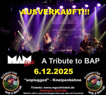 “MAM“ – A TRIBUTE TO “BAP“ – (unplugged) Live am 6.12.2025 ab 20:00 Uhr – Kneipenbühne AUSVERKAUFT!!! Moers-Scherpenberg: Am Samstag, den 6. Dezember kommt die „BAP“ Tribute-Band “MAM“ ab 20:00 Uhr wieder in den Moerser Dschungel-Club. Man kann wohl ohne Übertreibung sagen, dass die aus 8 Musikern bestehende Band zu den besten Tribute Acts in ganz Europa zählt. Wer “MAM“ zum ersten Mal erlebt, kommt aus dem Staunen gar nicht mehr heraus, den man denkt, auf einem Live-Konzert von “BAP“ zu sein. Noch näher am Original und noch besser ist tatsächlich nicht mehr machbar, was sicherlich alle, die “MAM“ schon mal erlebt haben, ohne Zögern bestätigen würden. Bei diesem Event dürfen sich die Besucher auf eine hochprofessionelle, musikalische Punktlandung freuen, mit einem beeindruckenden Sound, der gute Laune macht und nachhaltig positive Wirkung hat. MAM rockt BAP – und das schon seit über 19 Jahren! Und das gibt es nun auch in einer unplugged-Version! Hier werden die bekannten BAP-Hits und verborgende Schätze in neuem Gewand präsentiert, gespielt u.a. mit Akustik-Gitarre, Geige, Saxophon oder Mandoline. Besonders gut kommen natürlich Balladen wie „Du kanns zaubere“, „Für ne Moment“ oder „Alles em Lot“ zur Geltung. Aber auch die akustischen Versionen von „Ne schöne Jrooß“, Frau ich freu mich“ oder „Verdamp lang her“ haben ihren ganz speziellem Reiz. Dazu kommen eigene akustische Versionen vieler bekannter und weniger bekannter BAP-Klassiker. MAM hat sich einiges einfallen lassen – ihr dürft gespannt sein. Und wenn der Funke überspringt, hält es irgendwann weder das Publikum noch die Musiker auf ihren Sitzen. Das Konzert ist wegen der besonderen Atmosphäre bestuhlt. Das bedeutet, es gibt weniger Tickets als üblich. Beeilt euch also am besten! MAM sind: Klaus Drotbohm-voc, Oliver Küster-git., Marc Maecces Juras-bs., Marco Beier-dr., Christoph Freitag-sax., Oliver Rebhan-key., Christian Ebert-git. Die Kölner Band “MAM“ begeistert jetzt schon seit vielen Jahren als musikalisch erfahrene Live-Band vor allem durch große Spielfreude und eine verblüffend hohe stimmliche Authentizität des Sängers. BAP-Frontmann Wolfgang Niedecken und Ex-Gitarrist Klaus „Major“ Heuser haben die Band schon gesehen und waren beeindruckt. Beim Tour-start 2011 in der Bonner Harmonie durfte “MAM“ den „Major“ sogar als „Special Guest“ präsentieren – eine Anerkennung für die Band wie sie größer wohl nicht sein kann. Die bis zu dreieinhalb Stunden dauernde BAP-Tribute-Show lässt mit den großen Hits der 80er-Jahre (u. a. Frau ich freu mich, Do kanns zaubere, Kristallnaach, Verdamp lang her) das BAP-Feeling der Durchbruchzeit wieder aufleben und garantiert einen mitreißenden Kölschrock-Abend. Daneben hat MAM aber auch noch ein stimmungsvolles unplugged-Programm erarbeitet, bei dem die BAP-Klassiker in einer akustischen Instrumentierung präsentiert werden. Unplugged war die Band zuletzt im Vorprogramm der Leverkusener Jazztage zu sehen. MAM hat sich mittlerweile in der ersten Liga der Tribute-Szene etabliert. So ziehen sie bei ihren Konzerten im Köln-Bonner-Raum nicht nur regelmäßig 400-500 Besucher an, sondern sind auch beliebter Publikumsmagnet auf Stadt- und Musikfesten geworden. Höhepunkte der letzten Jahre waren u.a. die Auftritte beim renommierten Leverkusener Musik-Festival „Streetlife“, „Rhein in Flammen“ in den Bonner Rheinauen und das Bielstein Open Air, wo MAM vor Weltstars wie 10cc und Barclay James Harvest auftreten durfte. Wichtiger Hinweis: Das Konzert findet vorne in der Kneipe des Clubs statt! (Nur Stehtische, teilweise mit Barhocker) Der Einlass zur gesamten Gaststätte wird an diesem Abend bis ca. 23:00 Uhr ausnahmsweise nur mit einer gültigen Eintrittskarte gewährt! Der Veranstalter bittet alle Gäste um Verständnis! Kleiner Tip: Interessierte sollten damit rechnen, dass die Veranstaltung schon während den Vorverkaufs ausverkauft sein wird! Auf die Abendkasse sollte man sich von daher besser nicht verlassen! Eintritt: Vorverkauf 29,40 € (inkl. aller Gebühren) Abendkasse 32,- € VVK-Beginn: 23.06.2025 VVK-Stellen: Nur im Online-Shop über www.rogschticket.de Einlass: ab 18:00 Uhr Beginn: 20:00 Uhr Weitere Info’s: www.mam-live.de / www.dschungel-club.com oder bei Facebook Links: http://www.youtube.com/user/MAMlive https://www.youtube.com/watch?v=Uz63W4EKZ5w