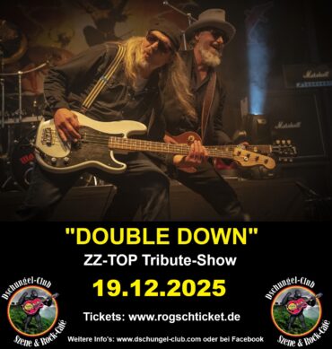 “DOUBLE DOWN“ – “ZZ TOP“ Tribute-Show Live am 19.12.2025 ab 20:00 Uhr im Dschungel-Club Moers Moers-Scherpenberg: Am Freitag, den 19. Dezember kommt die ZZ-TOP Tribute Band “DOUBLE DOWN“ zum zweiten Mal ab 20:00 Uhr in den Moerser Dschungel-Club. WER BEI IHREM ERSTEN KONZERT DABEI WAR WEISS, DASS MAN HIER ABSOLUTE TOP-QUALITÄT AUF HÖCHSTEM PROFESSIONELLEN NIVEAU GEBOTEN BEKOMMT!!! NOCH NÄHER AM ORIGINAL IST NICHT MEHR MÖGLICH!!!!!!!!! UNSER TIP: DIE BAND IST DER HAMMER!!!!!!!! Double Down – A Tribute to ZZ Top Double Down sind „On A Mission From God!“ – ganz wie die legendären ‚Blues Brothers‘ es ausdrückten. Die drei Musiker aus dem rheinischen ‚Mississippi Delta‘ erwecken die explosive Mischung der ZZ Top Songs auf der Bühne neu zum Leben. Gegründet im Jahr 2023 in der Region Köln-Bonn, gilt ihre Leidenschaft besonders den klassischen ZZ Top Hits. Auf der Bühne begeistern Double Down mit ihrer unglaublichen Spielfreude und Spontaneität. Der Spaß steht ihnen förmlich ins Gesicht geschrieben! Double Down liefern den authentischen ZZ Top Sound, kraftvoll und mit ordentlich Röhrenpower. Sie gehen über die Originalvorlagen hinaus, geben ihren Songs eine frische Note. Double Down – ein Begriff aus dem Blackjack, der doppelten Einsatz bedeutet. Der Name ist Programm: Erlebe Double Down Live und genieße die verdoppelte Intensität, doppelten Schweiß und doppelten Spaß! Double Down sind: Uwe „Reverend“ B. – Gitarre/Gesang Michael Fuß – Bass/Gesang Peter Hensen – Drums Ein schneller Video Einblick: Youtube Kanal: https://www.youtube.com/@Huey2023 Eintritt: 16,25 € Vorverkauf (inkl. aller Gebühren) 18,- € Abendkasse VVK-Stellen: Nur im Online-Shop bei www.rogschticket.de VVK-Beginn: 20.07.2025 Geöffnet: ab 18:00 Uhr Einlass: ab 19:30 Uhr Beginn: 20:00 Uhr Weitere Info’s: www.dschungel-club.com oder bei Facebook und unter www.DoubleDownLive.de