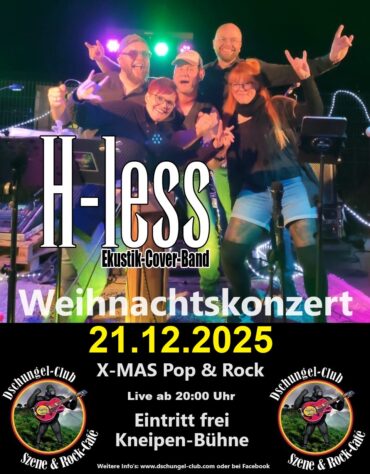 “H-less“ – X-MAS Pop & Rock – Live am 21.12.2025 ab 20:00 Uhr im Dschungel-Club Moers – Eintritt frei – Kneipenbühne Wir bitten möglichst um Platzreservierungen! Moers-Scherpenberg: Am Sonntag, den 21. Dezember kommt ab 20:00 Uhr die Band “H-less“ nach ihrem riesigen Erfolg in den letzten Jahren wieder in den Moerser Dschungel-Club und stimmt schon einmal auf das kommende Weihnachtsfest ein. Ein stimmungsvoller Abend mit X-MAS Pop & Rock erwartet die Besucher! Seit fast 20 Jahren bringt die Partycoverband H-less aus Oberhausen mit reichlich Pop- und Rockmusik verschiedener Jahrzehnte beste Stimmung auf die Bühnen der Region. Selbstbewusst bezeichnen die 5 Musiker ihren Stil als „Ekustik-Cover“, der für die unvergleichliche Kombination akustischer und elektronischer Elemente an Gitarre, Bass, Drums und der doppelt geballten Frauenpower an den Vocals steht. Ob rockige oder sanfte Töne, hier ist für jeden Zuhörer was dabei. Viel Liebe zum Detail und die Freude an der Musik ließen ihre Fangemeinde auf zahlreichen Konzerten in den letzten Jahren stetig wachsen. Kurz vor dem großen Fest kommt die Band nun für ein Weihnachtskonzert in den Dschungel. Ganz im Zeichen ihres Namens (H-less = zeitlos) interpretiert die Band am 21.12.2025, neben ihrem Repertoire aus Rock & Pop, zahlreiche internationale Weihnachtsklassiker von „All I Want For Christmas Is You“ über „Jingle Bell Rock“ bis hin zu „Last Christmas“. Kommt vorbei und freut euch auf einen stimmungsvollen vorweihnachtlichen Abend im Dschungel mit der Ekustik-Cover-Band H-less. Mehr Infos unter www.h-less.de Eintritt frei! – Die Band freut sich über Spenden! Einlass: ab 18:00 Uhr Beginn: 20:00 Uhr Weitere Info’s: www.dschungel-club.com oder bei Facebook