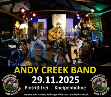“ANDY CREEK BAND“ Live am 29.11.2025 ab 20:00 Uhr im Dschungel-Club Moers – Eintritt frei – Kneipenbühne Moers-Scherpenberg: Nach dem riesigen Erfolg in 2024 kommt am Samstag, den 29. November ab 20:00 Uhr die “ANDY CREEK BAND“ mit einem beeindruckenden Querschnitt durch die Rock-Geschichte zum zweiten Mal in den Moerser Dschungel-Club. Es wird möglichst um Platzreservierungen gebeten! Die „Andy Creek Band“ aus dem Sauerland, sind 3 Musiker mit Spaß und Leidenschaft, die ihre Lieblingssongs unplugged, hand und fußgemacht, mit vielen Instrumenten und 3 stimmigen Gesang präsentieren. Von Led Zeppelin, Selig, Udo Lindenberg über Mumford & Sons, Traveling Wilburys, Bruce Springsteen oder Beatles, zeigen sie eine Biergarten-Lagerfeueratmosphäre die begeistert. Eintritt frei! – Die Band freut sich über Spenden! Geöffnet ab 18:00 Uhr Beginn: 20:00 Uhr Weitere Info’s: www.dschungel-club.com oder bei Facebook